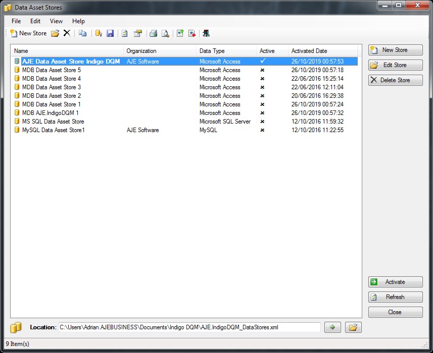 Indigo DQM allows multiple Data Assets Stores to be configured with Data Asset Stores Tool. Different Data Stores can be added, edited, deleted and activated.