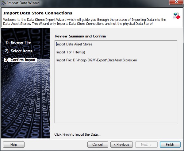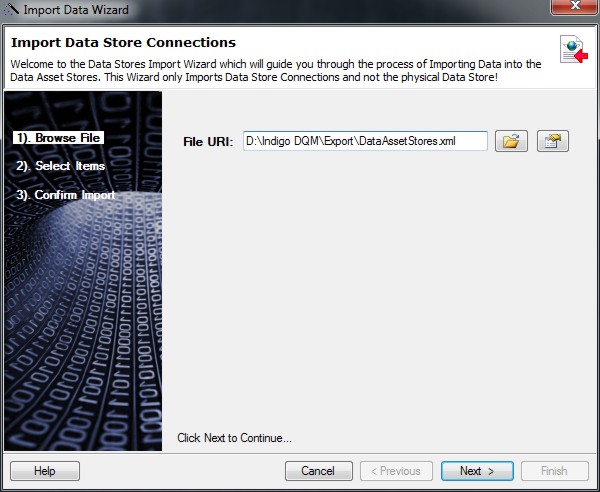 Indigo DQM Data Asset Store Connections can be imported using the Import Wizard on the Data Asset Stores Tool.