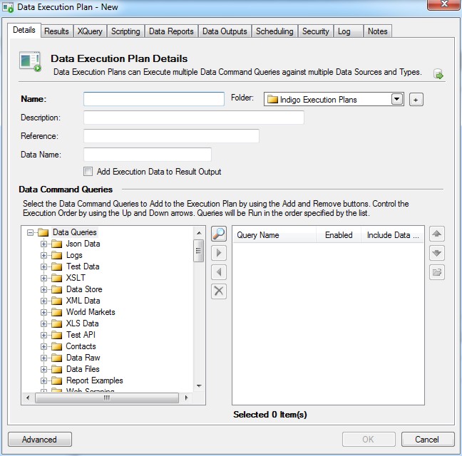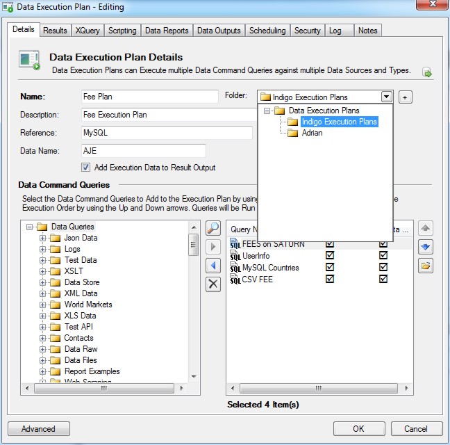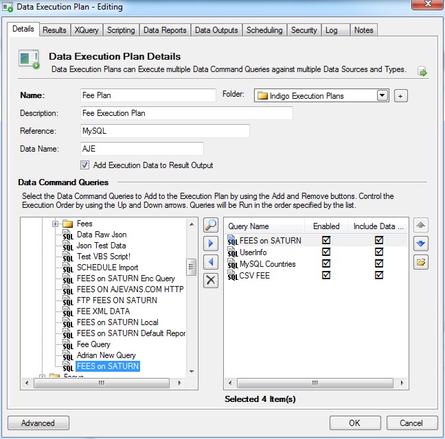 Select the Data Command Queries to run in the Data Execution Plan and select the order in which you want them to execute by using the up and down arrow buttons. You can also choose to include or exclude the result as part of the Execution Plan.