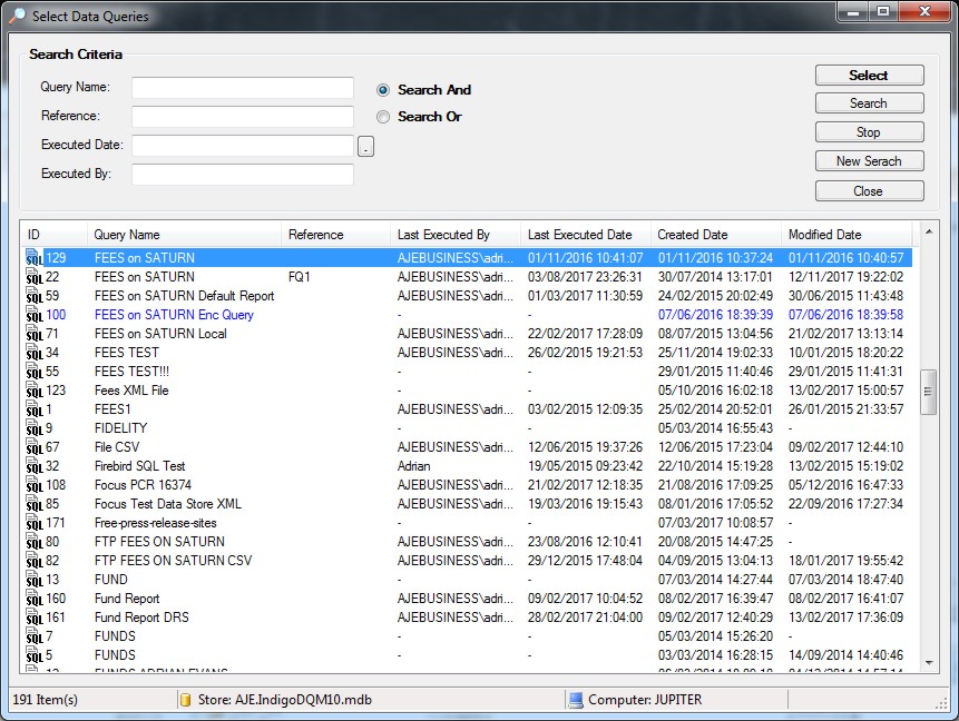 Data Queries can be searched by the name, reference and execution time. If the Data Asset Store contains many queries it may be necessary to quickly locate one by using the search form.