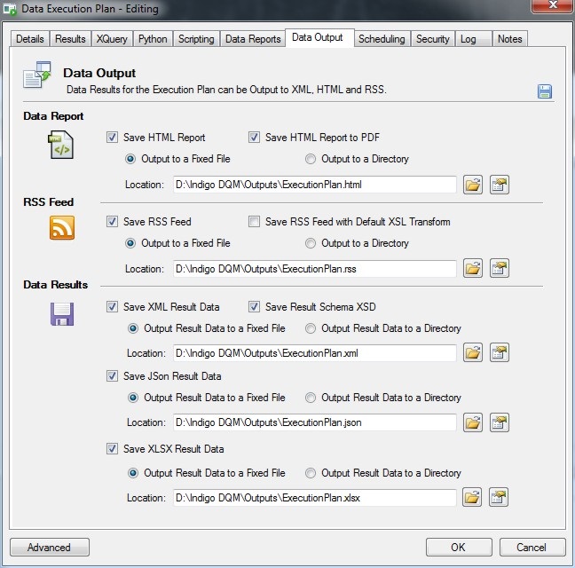 Indigo DQM's Data Management Engine (DME) can output and automatically save Data and Reports for Data Execution Plans in various formats including HTML, PDF, RSS, XML, JSon, XLSX and CSV.