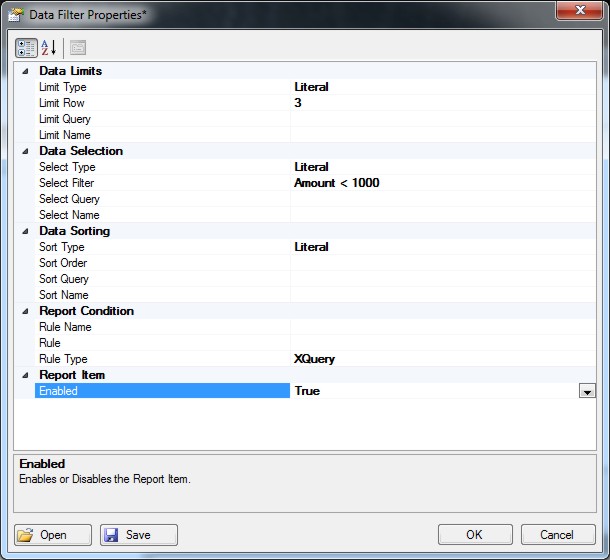 To enable Data Filtering click the Data Filter (...) property button to open the filter properties page or use the Data Filter Designer.