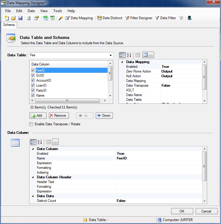 Click the Data Mapping button to open the Data Source Designer for Data Mapping. Select the Table Name from the drop-down list and then add the Data Columns to include and the order in which they should be presented.