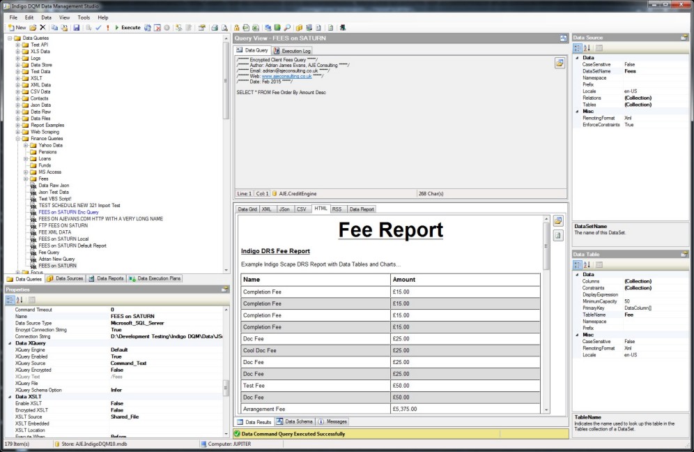 Indigo DQM Data Results can be output into various formats including XML, JSon, CSV, HTML, RSS and custom HTML and RDL Data Reports.