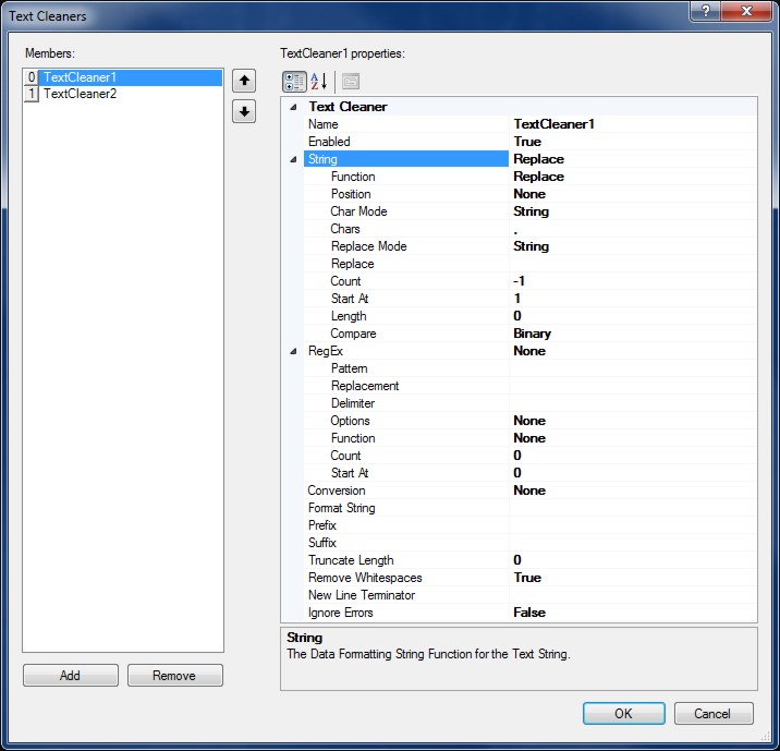 Text Cleaner members can be moved up and down using the arrow buttons to control the order in which they are applied.