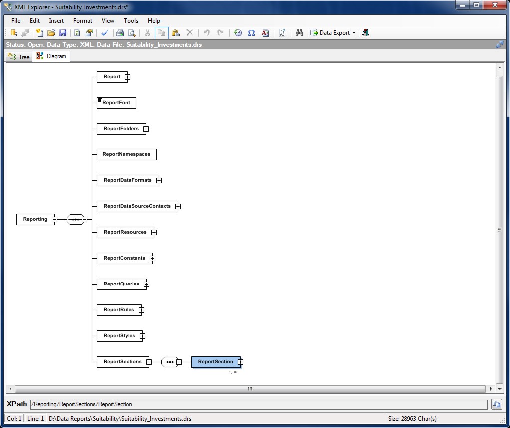 The XML Explorer Tree View is a visual representation of an XML document and allows navigation of the Data by expanding out elements and generating XPath expressions. XML Data for the Tree Node is shown in the XML Editor and can be updated.