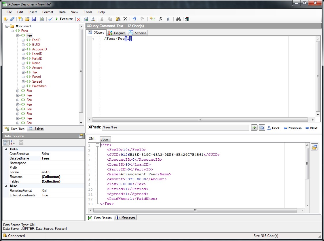 Selecting a node in the Data Tree will update the current XPath for that node. The XPath expression can then be used to query a Data Source.