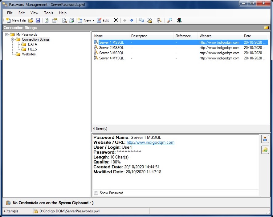 Indigo Password Management Tool (PMT) is a professional password management system that allows sensitive user logins and passwords and / or credentials to be managed, organised and securely stored in an AES encrypted data file with easy and quick access to the secured data.