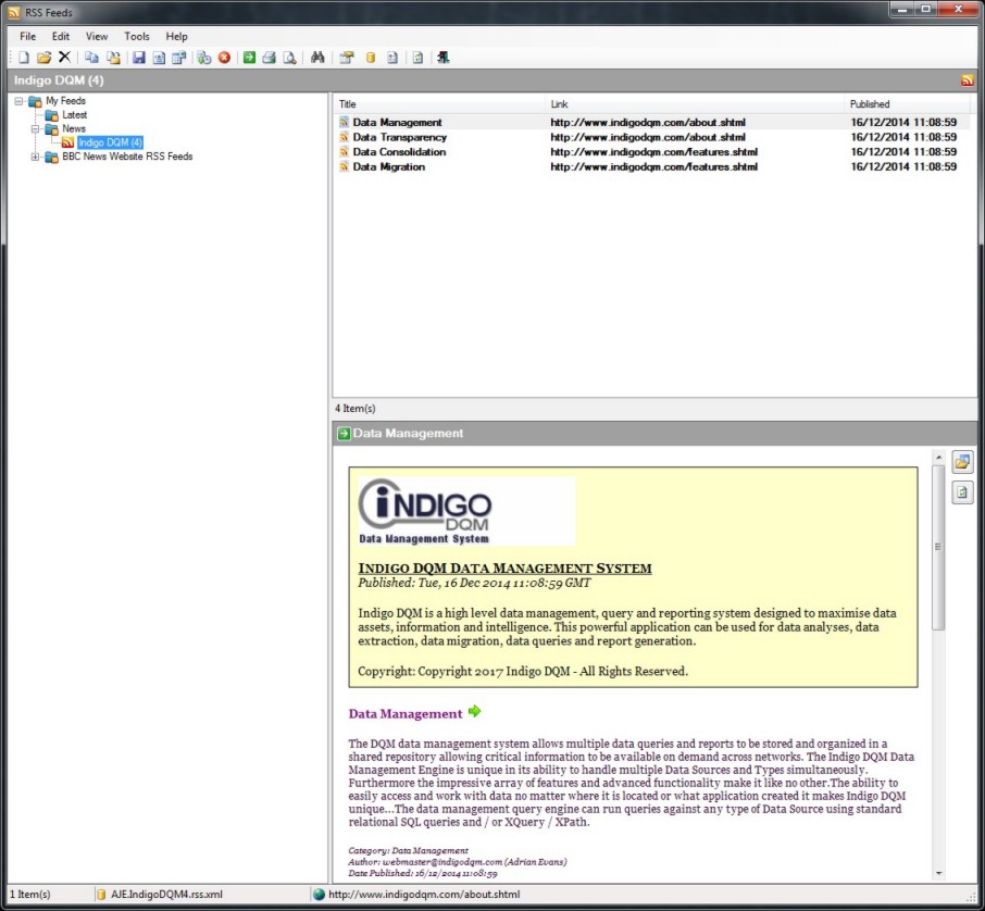 Indigo DQM RSS news aggregator will automatically check RSS Feeds for new content and display the output. Feeds can be organised into Folders to categorise Feed content.