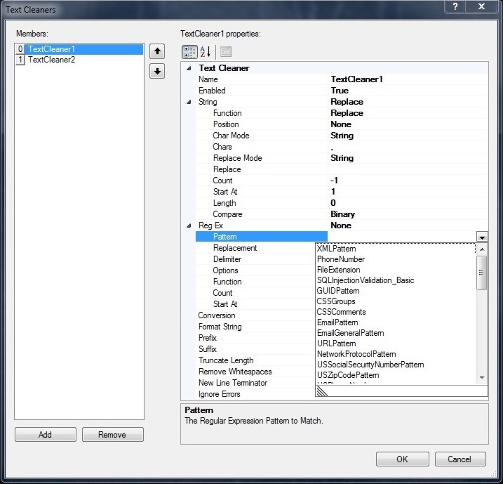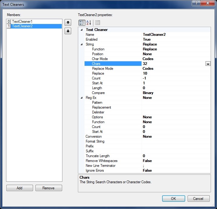 Text Cleaner members can be moved up and down using the arrow buttons to control the order in which they are applied.