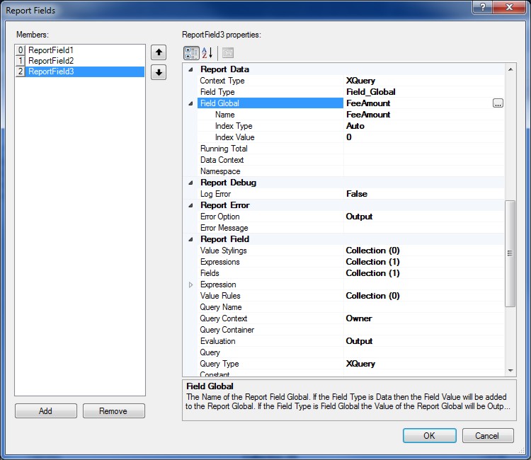 The Field Data Type specifies if the Field Value is stored in a Report Global or output the Report Global for the Report Field.